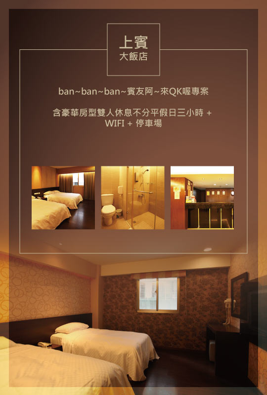只要550元,即可享有【台北-上賓大飯店】ban~ban~ban~賓友阿~來QK喔專案〈含豪華房型雙人休息不分平假日三小時 + WIFI + 停車場〉